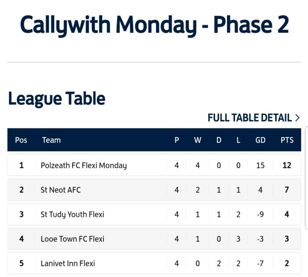 This victory sees St Neot progress to the semi final of the flexi league to play the winners of Tuesday night’s league. This fixture will be played next Tuesday 5th April at Callywith Collge with the changed kick off time of 7:15pm